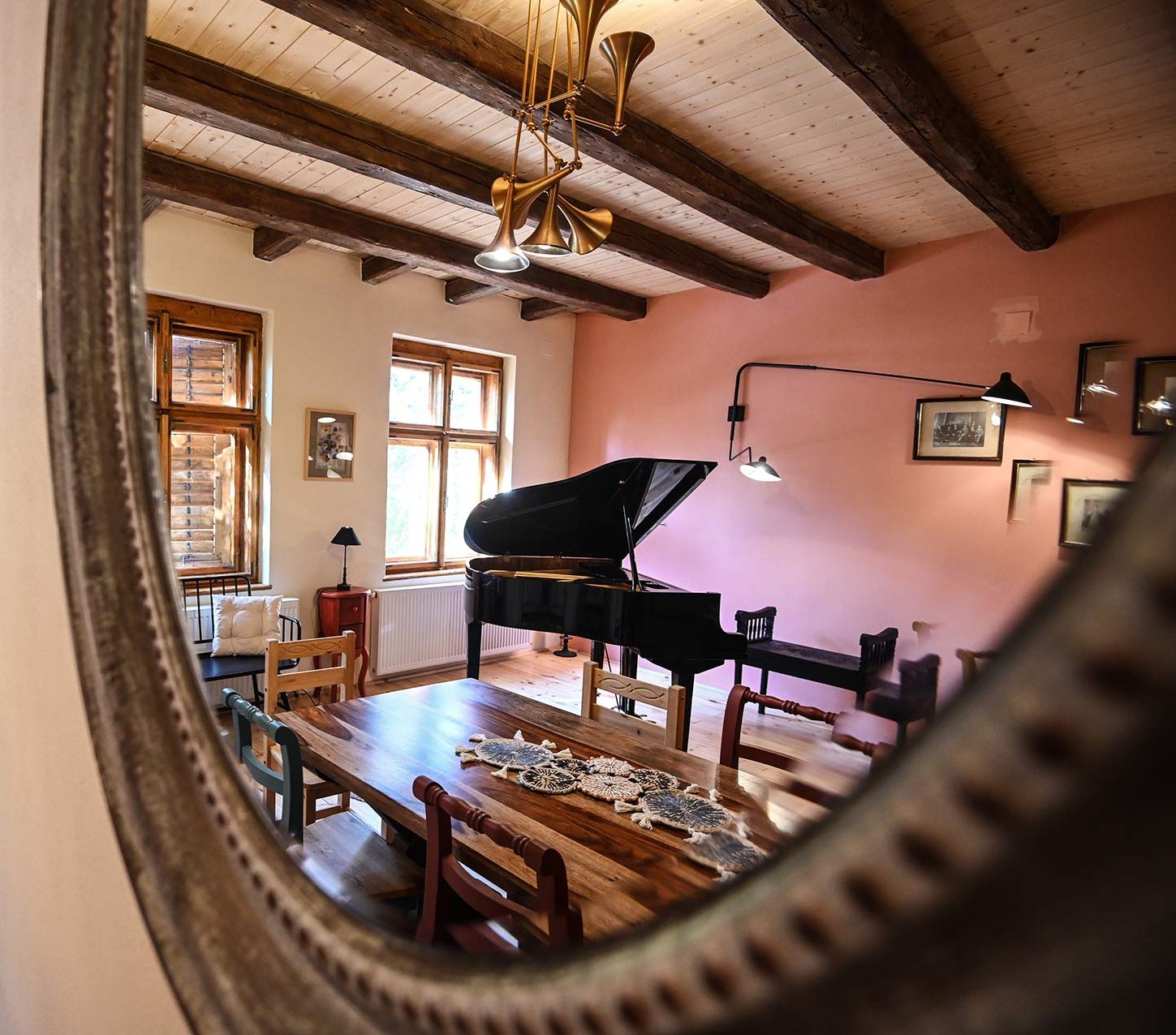 În această cameră, elementul central e pianul. Însă rolul acestuia este nu doar să educe, dar și să adune comunitatea. De aceea, elemente ale comunității locului în care ne aflăm își găsesc locul peste tot în acest spațiu.